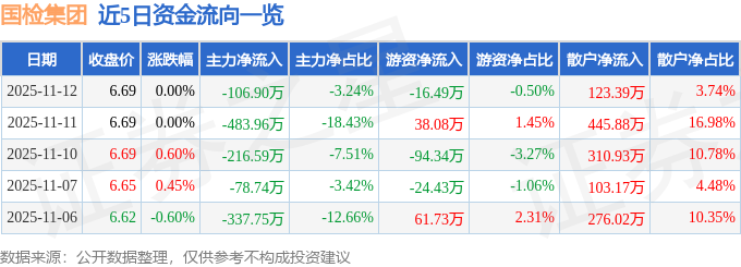 证券之星消息,截至2025年11月12日收盘,国检集团(603060)报收于6.69元,上涨0.0%,换手率0.61%,成交量4.93万手,成交额3300.52万元。