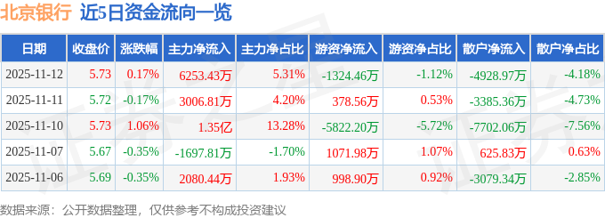 证券之星消息,截至2025年11月12日收盘,北京银行(601169)报收于5.73元,上涨0.17%,换手率0.97%,成交量205.2万手,成交额11.78亿元。