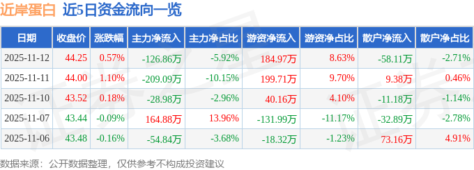 证券之星消息,截至2025年11月12日收盘,近岸蛋白(688137)报收于44.25元,上涨0.57%,换手率1.5%,成交量4889.0手,成交额2143.75万元。