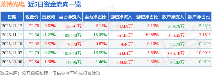 证券之星消息,截至2025年11月12日收盘,莱特光电(688150)报收于22.78元,上涨0.62%,换手率0.81%,成交量3.27万手,成交额7449.64万元。