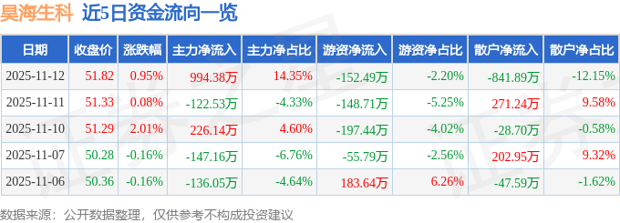 11月12日的资金流向数据方面,主力资金净流入994.38万元,占总成交额14.35%,游资资金净流出152.49万元,占总成交额2.2%,散户资金净流出841.89万元,占总成交额12.15%。