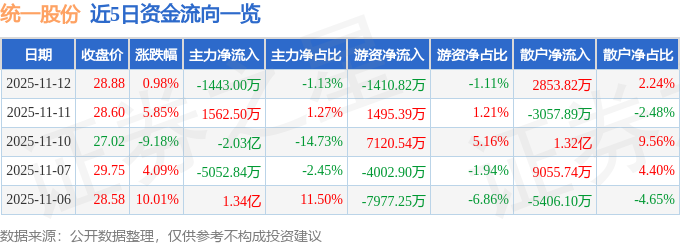 证券之星消息,截至2025年11月12日收盘,统一股份(600506)报收于28.88元,上涨0.98%,换手率30.25%,成交量44.69万手,成交额12.72亿元。