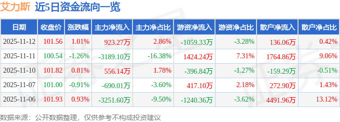 证券之星消息,截至2025年11月12日收盘,艾力斯(688578)报收于101.56元,上涨1.01%,换手率0.7%,成交量3.17万手,成交额3.23亿元。