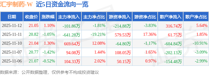 证券之星消息,截至2025年11月12日收盘,汇宇制药(688553)报收于21.05元,上涨1.1%,换手率0.78%,成交量2.67万手,成交额5615.4万元。