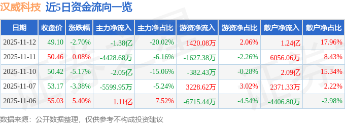 11月12日的资金流向数据方面,主力资金净流出1.38亿元,占总成交额20.02%,游资资金净流入1420.08万元,占总成交额2.06%,散户资金净流入1.24亿元,占总成交额17.96%。