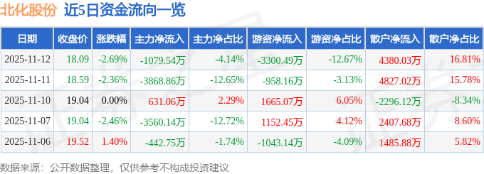 证券之星消息,截至2025年11月12日收盘,北化股份(002246)报收于18.09元,下跌2.69%,换手率2.62%,成交量14.41万手,成交额2.6亿元。