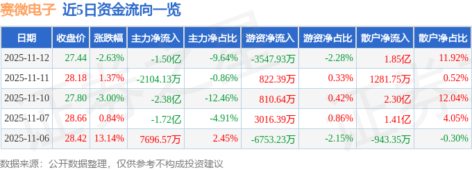 证券之星消息,截至2025年11月12日收盘,赛微电子(300456)报收于27.44元,下跌2.63%,换手率9.56%,成交量57.14万手,成交额15.55亿元。
