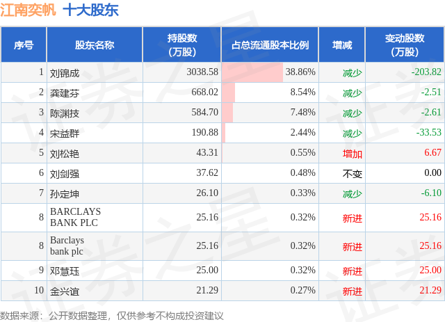 根据江南奕帆2025年三季报公布的十大股东详情如下: