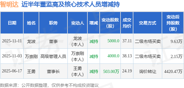 智明达近半年内的董监高及核心技术人员增减持详情如下: