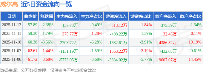 证券之星消息,截至2025年11月12日收盘,威尔高(301251)报收于57.89元,下跌2.38%,换手率9.02%,成交量4.86万手,成交额2.8亿元。