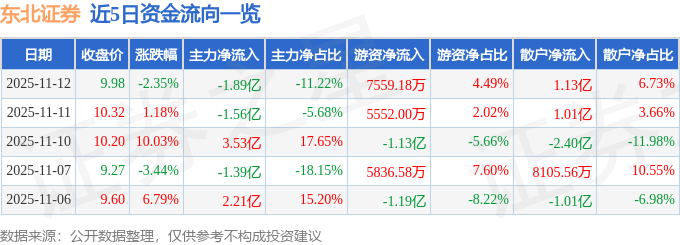 证券之星消息,截至2025年11月12日收盘,东北证券(000686)报收于9.98元,下跌2.35%,换手率7.31%,成交量171.2万手,成交额16.85亿元。