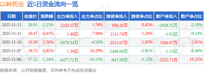 证券之星消息,截至2025年11月12日收盘,以岭药业(002603)报收于20.01元,下跌2.25%,换手率4.86%,成交量66.86万手,成交额13.45亿元。