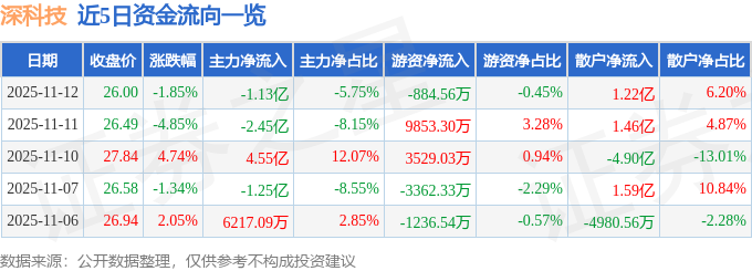 证券之星消息,截至2025年11月12日收盘,深科技(000021)报收于26.0元,下跌1.85%,换手率4.84%,成交量76.1万手,成交额19.71亿元。