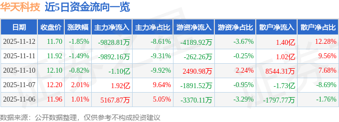 11月12日的资金流向数据方面,主力资金净流出9828.81万元,占总成交额8.61%,游资资金净流出4189.92万元,占总成交额3.67%,散户资金净流入1.4亿元,占总成交额12.28%。