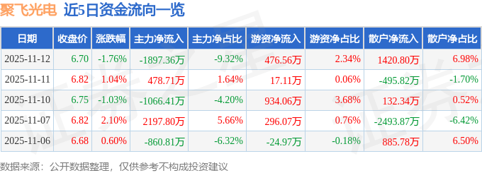 证券之星消息,截至2025年11月12日收盘,聚飞光电(300303)报收于6.7元,下跌1.76%,换手率2.28%,成交量30.33万手,成交额2.04亿元。
