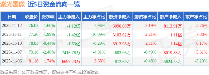 证券之星消息,截至2025年11月12日收盘,紫光国微(002049)报收于76.02元,下跌1.6%,换手率2.18%,成交量18.51万手,成交额14.08亿元。