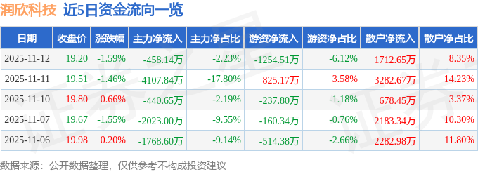 证券之星消息,截至2025年11月12日收盘,润欣科技(300493)报收于19.2元,下跌1.59%,换手率2.1%,成交量10.65万手,成交额2.05亿元。