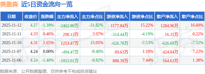 证券之星消息,截至2025年11月12日收盘,美盈森(002303)报收于4.27元,下跌1.39%,换手率1.87%,成交量18.07万手,成交额7740.03万元。