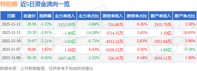 证券之星消息,截至2025年11月12日收盘,特锐德(300001)报收于28.9元,下跌1.37%,换手率2.76%,成交量28.46万手,成交额8.2亿元。