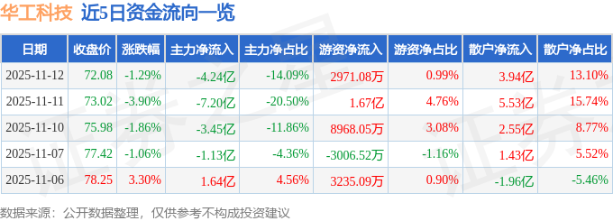 证券之星消息,截至2025年11月12日收盘,华工科技(000988)报收于72.08元,下跌1.29%,换手率4.16%,成交量41.79万手,成交额30.09亿元。