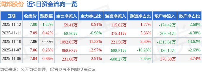 证券之星消息,截至2025年11月12日收盘,润邦股份(002483)报收于7.0元,下跌1.27%,换手率1.04%,成交量9.25万手,成交额6505.4万元。