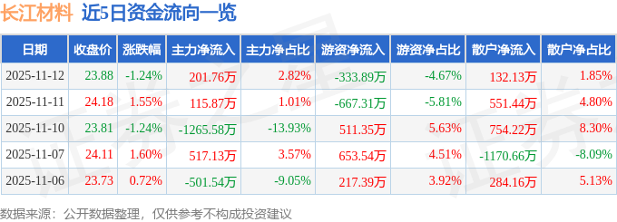 证券之星消息,截至2025年11月12日收盘,长江材料(001296)报收于23.88元,下跌1.24%,换手率3.9%,成交量3.0万手,成交额7147.46万元。