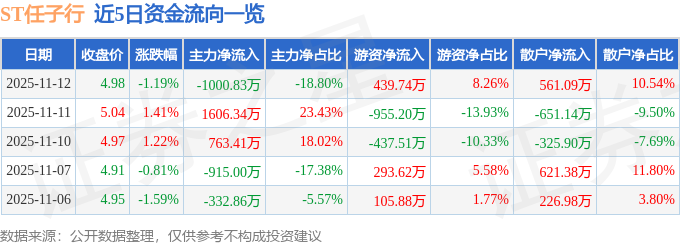 证券之星消息,截至2025年11月12日收盘,ST任子行(300311)报收于4.98元,下跌1.19%,换手率1.99%,成交量10.68万手,成交额5323.41万元。