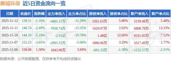 证券之星消息,截至2025年11月12日收盘,惠城环保(300779)报收于139.11元,下跌1.16%,换手率1.79%,成交量2.81万手,成交额3.9亿元。