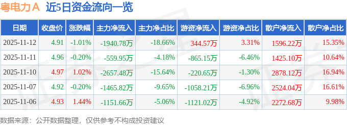 证券之星消息,截至2025年11月12日收盘,粤电力A(000539)报收于4.91元,下跌1.01%,换手率0.83%,成交量21.14万手,成交额1.04亿元。