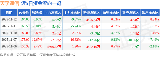 11月12日的资金流向数据方面,主力资金净流出5.33亿元,占总成交额9.07%,游资资金净流入4895.84万元,占总成交额0.83%,散户资金净流入4.84亿元,占总成交额8.24%。