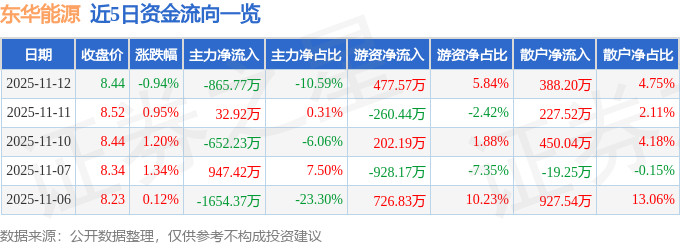 证券之星消息,截至2025年11月12日收盘,东华能源(002221)报收于8.44元,下跌0.94%,换手率0.66%,成交量9.65万手,成交额8173.45万元。