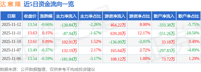 证券之星消息,截至2025年11月12日收盘,达 意 隆(002209)报收于13.54元,下跌0.66%,换手率2.74%,成交量4.29万手,成交额5801.29万元。