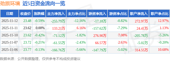 证券之星消息,截至2025年11月12日收盘,劲旅环境(001230)报收于23.48元,下跌0.59%,换手率1.68%,成交量8923.0手,成交额2104.05万元。