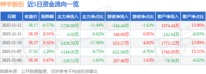 证券之星消息,截至2025年11月12日收盘,神宇股份(300563)报收于38.17元,下跌0.57%,换手率3.21%,成交量3.98万手,成交额1.51亿元。