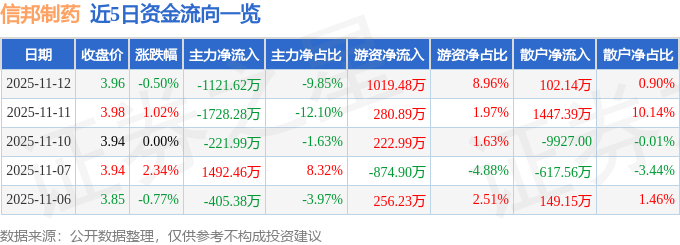 证券之星消息,截至2025年11月12日收盘,信邦制药(002390)报收于3.96元,下跌0.5%,换手率1.49%,成交量28.72万手,成交额1.14亿元。