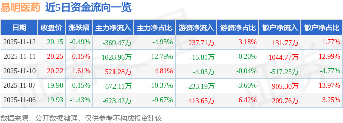 证券之星消息,截至2025年11月12日收盘,易明医药(002826)报收于20.15元,下跌0.49%,换手率2.12%,成交量3.69万手,成交额7464.49万元。