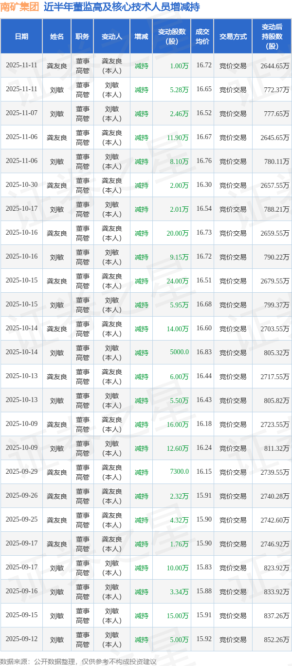 证券之星消息,根据11月12日市场公开信息、上市公司公告及交易所披露数据整理,南矿集团(001360)最新董监高及相关人员股份变动情况:2025年11月11日公司董事,高管龚友良、董事,高管刘敏共减持公司股份6.28万股,占公司总股本为0.0308%。变动期间公司股价上涨0.61%,11月11日当日收盘报16.57元。