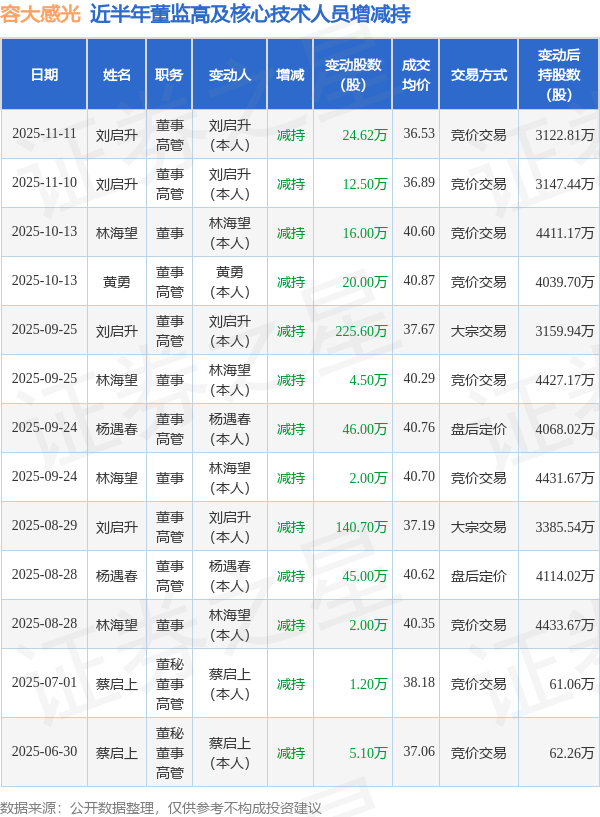 容大感光近半年内的董监高及核心技术人员增减持详情如下: