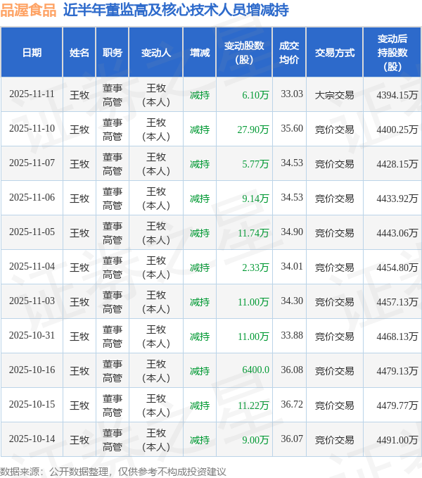 证券之星消息,根据11月12日市场公开信息、上市公司公告及交易所披露数据整理,品渥食品(300892)最新董监高及相关人员股份变动情况:2025年11月11日公司董事,高管王牧共减持公司股份6.1万股,占公司总股本为0.061%。变动期间公司股价上涨1.77%,11月11日当日收盘报37.35元。