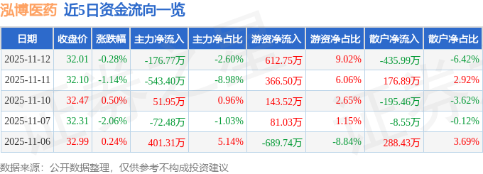 证券之星消息,截至2025年11月12日收盘,泓博医药(301230)报收于32.01元,下跌0.28%,换手率1.68%,成交量2.11万手,成交额6795.17万元。