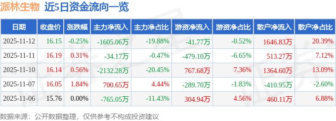 证券之星消息,截至2025年11月12日收盘,派林生物(000403)报收于16.15元,下跌0.25%,换手率0.53%,成交量5.0万手,成交额8075.64万元。