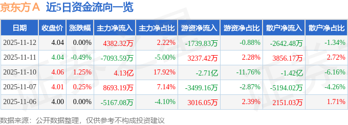 证券之星消息,截至2025年11月12日收盘,京东方A(000725)报收于4.04元,上涨0.0%,换手率1.33%,成交量489.12万手,成交额19.73亿元。