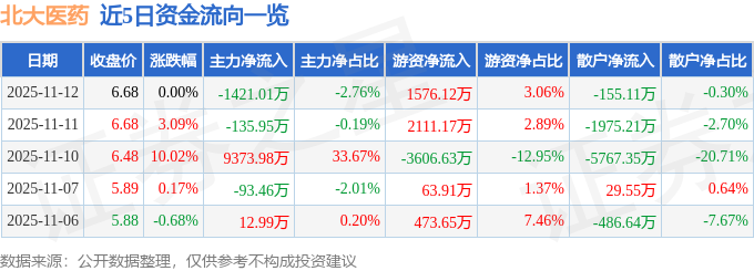 证券之星消息,截至2025年11月12日收盘,北大医药(000788)报收于6.68元,上涨0.0%,换手率13.01%,成交量77.56万手,成交额5.15亿元。