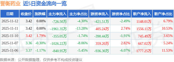证券之星消息,截至2025年11月12日收盘,誉衡药业(002437)报收于3.42元,上涨0.0%,换手率2.34%,成交量49.25万手,成交额1.69亿元。