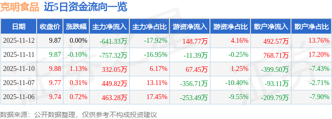 证券之星消息,截至2025年11月12日收盘,克明食品(002661)报收于9.87元,上涨0.0%,换手率1.15%,成交量3.63万手,成交额3578.65万元。