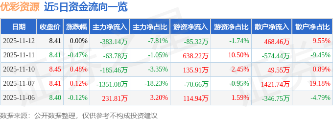 证券之星消息,截至2025年11月12日收盘,优彩资源(002998)报收于8.41元,上涨0.0%,换手率2.25%,成交量5.84万手,成交额4906.76万元。