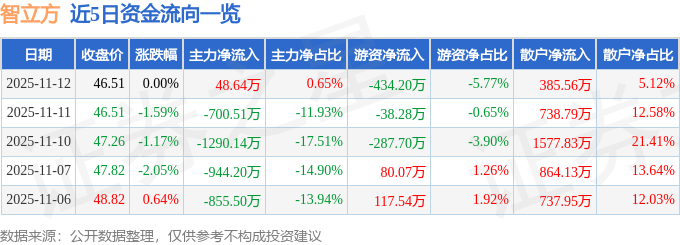 证券之星消息,截至2025年11月12日收盘,智立方(301312)报收于46.51元,上涨0.0%,换手率2.69%,成交量1.63万手,成交额7529.52万元。