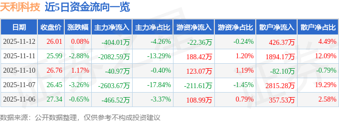 证券之星消息,截至2025年11月12日收盘,天利科技(300399)报收于26.01元,上涨0.08%,换手率1.86%,成交量3.67万手,成交额9492.15万元。
