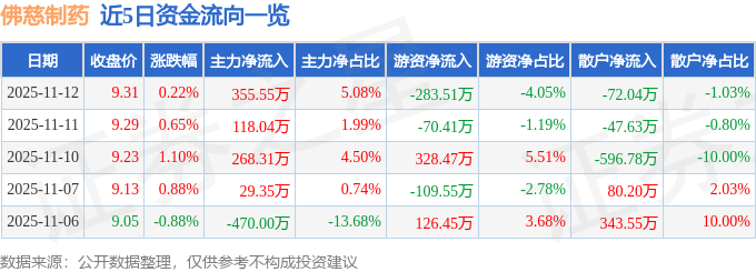 证券之星消息,截至2025年11月12日收盘,佛慈制药(002644)报收于9.31元,上涨0.22%,换手率1.47%,成交量7.5万手,成交额6994.85万元。