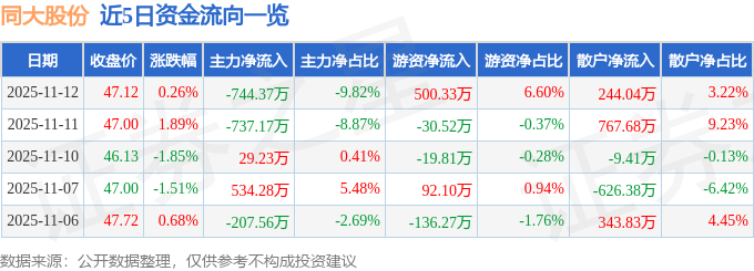 证券之星消息,截至2025年11月12日收盘,同大股份(300321)报收于47.12元,上涨0.26%,换手率1.82%,成交量1.61万手,成交额7583.52万元。